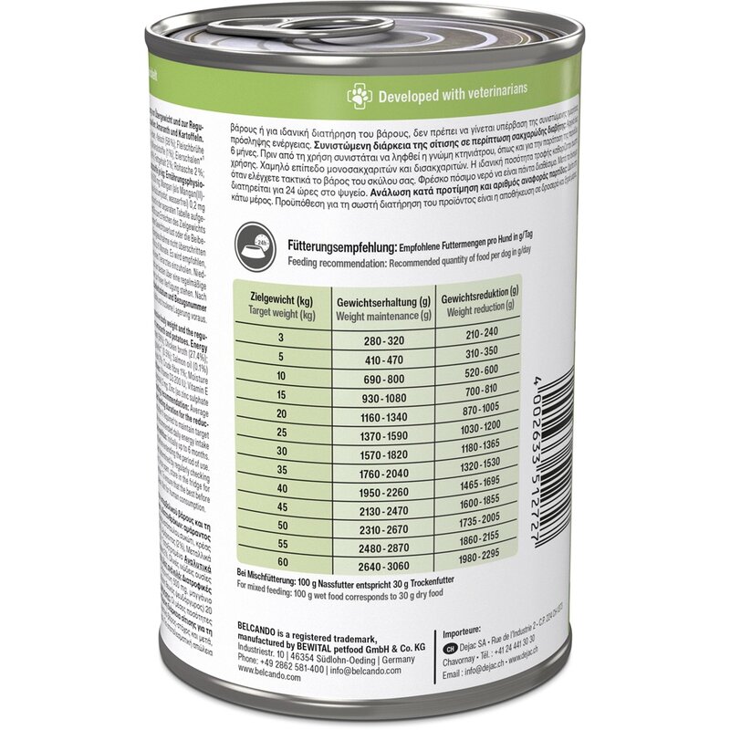 Durchschnittswerte für die Fütterung von Hunden sind in der separaten Tabelle aufgeführt. Empfohlene Fütterungsdauer zur Verringerung von Übergewicht: Bis zum Erreichen des Zielgewichts und nach Bedarf zur Aufrechterhaltung des Zielgewichts. Um einen effizienten Gewichtsverlust oder die Beibehaltung eines idealen Gewichts zu erzielen, sollte die empfohlene tägliche Energieaufnahme nicht überschritten werden. Empfohlene Fütterungsdauer bei Diabetes Mellitus: Zunächst bis zu 6 Monate. Es wird empfohlen, vor der Verwendung und vor Verlängerung der Fütterungsdauer den Rat eines Tierarztes einzuholen. Niedriger Mono- und Disaccharidgehalt. Die richtige Fütterungsmenge lässt sich am besten über eine regelmäßige Gewichtskontrolle des Hundes ermitteln. Frisches Trinkwasser sollte immer zur freien Verfügung stehen. Nach dem Öffnen max. 24 Stunden im Kühlschrank aufbewahren.