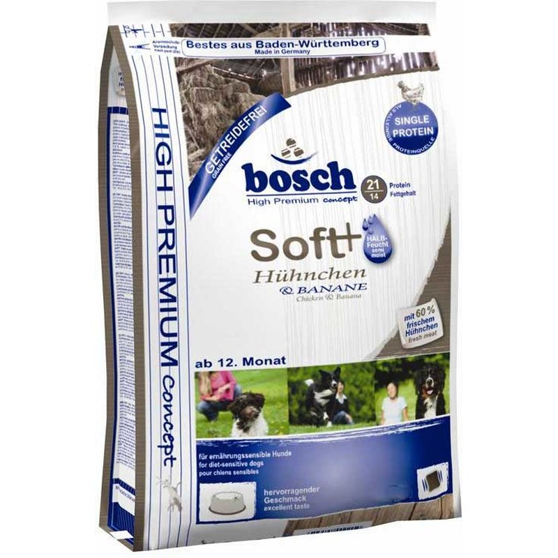 bosch Soft Hühnchen + Banane ist ein single Protein – Produkt für die ausgewogene Ernährung ausgewachsener Hunde aller Rassen. Der hohe Anteil an frischem Hühnchen (min. 60 %) als alleinige, tierische Proteinquelle verleiht dem Produkt eine außergewöhnliche Eiweißqualität. Durch die Verwendung stärkehaltiger Banane (min 8 %) als wichtigen Kohlenhydratträger sowie hochverdauliche Kartoffel ist Soft Hühnchen + Banane komplett getreidefrei. Der höhere Feuchtegehalt (18 %) verleiht der Krokette eine weiche Konsistenz.