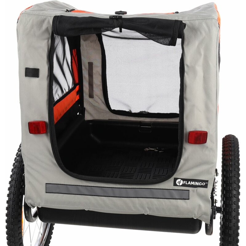 Nehmen Sie Ihren Hund mit auf Abenteuer mit dem Fahrradanhänger Jolene! Hergestellt aus strapazierfähigem Material mit breiten Rädern und Federung für Komfort. Geeignet für E-Bikes und ausgestattet mit Sicherheitsverriegelung und reflektierenden Details. Sicher und stilvoll durch die Farbkombination Grau & Orange.
