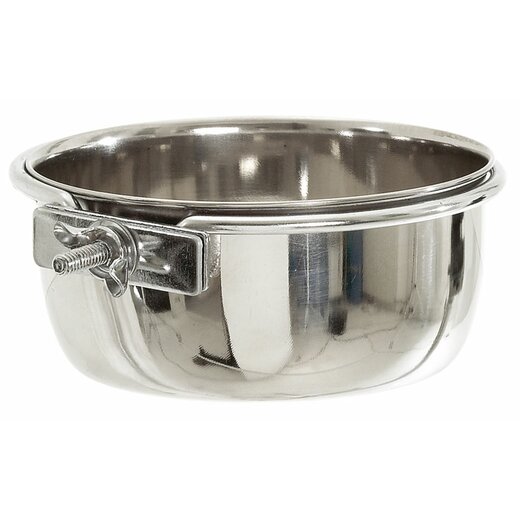 Futter- und Wassernapf aus rostfreiem Edelstahl, komplett mit Halterung zur Anbringung an Gitterwänden.