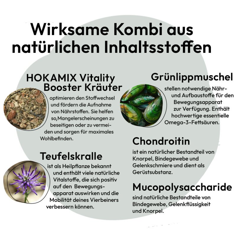 Dieses außergewöhnliche Kombinationsprodukt aus der Kräutermischung HOKAMIX 30 und verschiedenen, gelenkunterstützenden Nährstoffen, ist besonders sinnvoll: