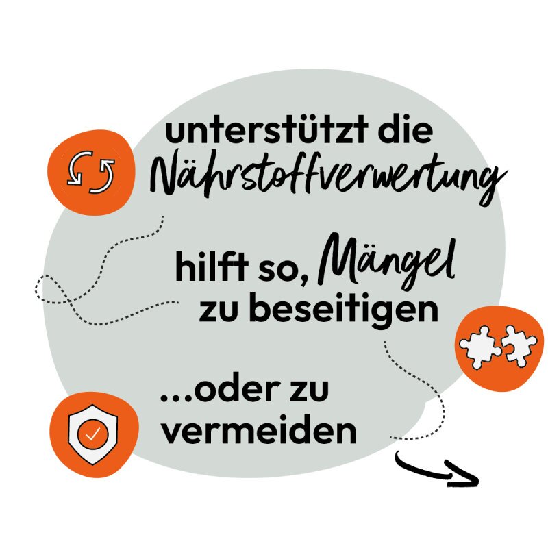 Die Heilkräutermischung gleicht ernährungsbedingte Mängel wie z.B. Haut-, Fell-, Sehnen und Bändernproblemen aus und hilft dem Körper, hochwertiges Futter optimal zu verdauen und zu verwerten.