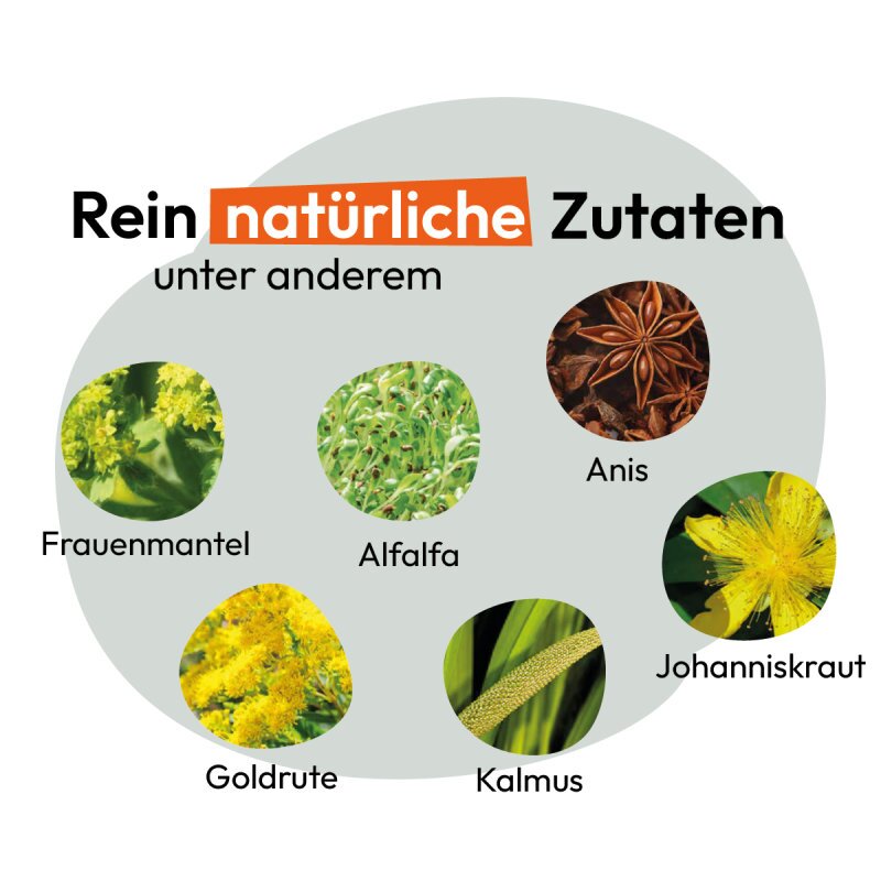 Alfalfa, Beinwell, Brennessel, Cayennepfeffer, Frauenmantel, Gewürzsumach, Goldrute, Johanniskraut, Kalmus, Kieselsäure, Klettenwurzel, Lungenkraut, Raute, Rosmarin, Schafgarbe, Stiefmütterchenkraut, Anis, Süßholzwurzel, Wacholder