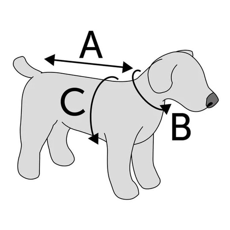 | Größe | Rückenlänge (A) | Halsumfang (B) | Brustumfang (C) |