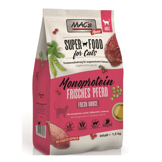 Für allergische oder empfindliche Samtpfoten ist MAC's Monoprotein Frisches Pferd genau das Richtige: Diese Variation besteht aus nur einer Fleischsorte als Proteinlieferant, kombiniert mit Süßkartoffel als Kohlenhydratquelle. Die getreidefreie Vollnahrung wurde speziell für empfindliche Katzen entwickelt und eignet sich zur Ausschlussdiät. Norwegisches Lachsöl ist reich an Omega-Fettsäuren und kann für eine gesunde Haut und ein glänzendes Fell sorgen. Cranberrys sind natürliche Säurebildner und können bakteriellen Blaseninfektionen vorbeugen. Ein echtes Super Food für deine Katze!