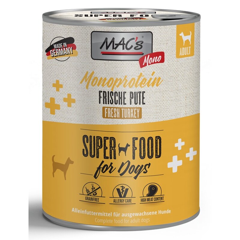 Für sensible Vierbeiner: MAC’s Mono Frische Pute ist ideal für empfindliche Hunde sowie zur Ausschlussdiät geeignet. Mit Pute als einzige tierische Proteinquelle, kombiniert mit Süßkartoffeln, Leinöl und Seealge bietet dieses Menü alles, was deine Fellnase für ein glückliches Hundeleben benötigt – getreidefrei und schonend zubereitet.